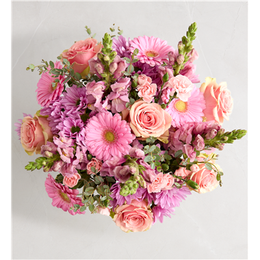 EXCLUSIVE Get them buzzing! A glorious mix of blooms in shades of pink and lavender, our eye-catching bouquet dazzles with color and texture. Designed in our Sweet As Can Bee artisanal vase, featuring an adorable honeybee, and accented with a raffia bow, it’s a gift that adds charm and beauty to any decor.